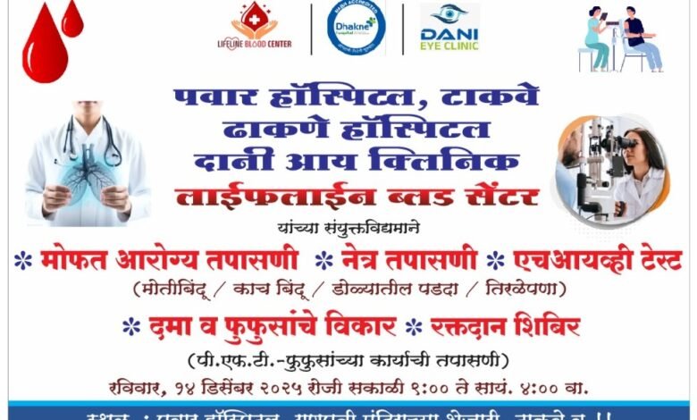 कार्यक्रमाचा तपशील: दिनांक: रविवार, १४ डिसेंबर २०२५ वेळ: सकाळी ९:०० ते सायंकाळी ४:०० वा. स्थळ: पवार हॉस्पिटल, गणपती मंदिराच्या शेजारी, टाकवे बु.॥